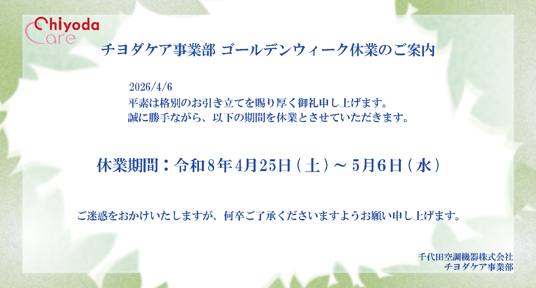 今後とも千代田空調機器株式会社ならびに「チヨダケア事業部」へのご支援・ご愛顧を賜りますよう心よりお願い申し上げます。